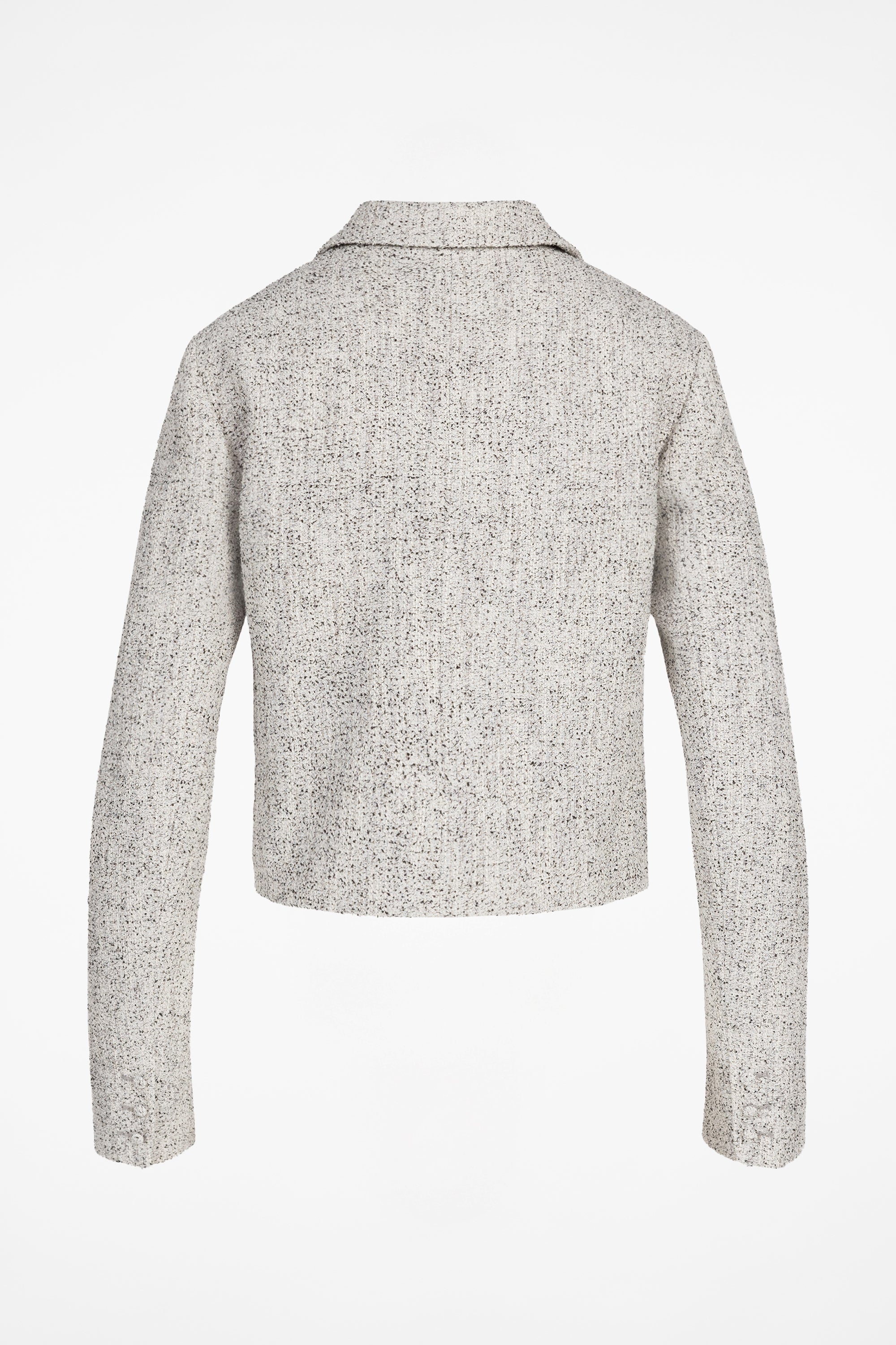 The Carnaby Edgeline Jacket uses textured dimensional bouclé with covered buttons and a classic shirt collar. Fully lined for comfort and shape.