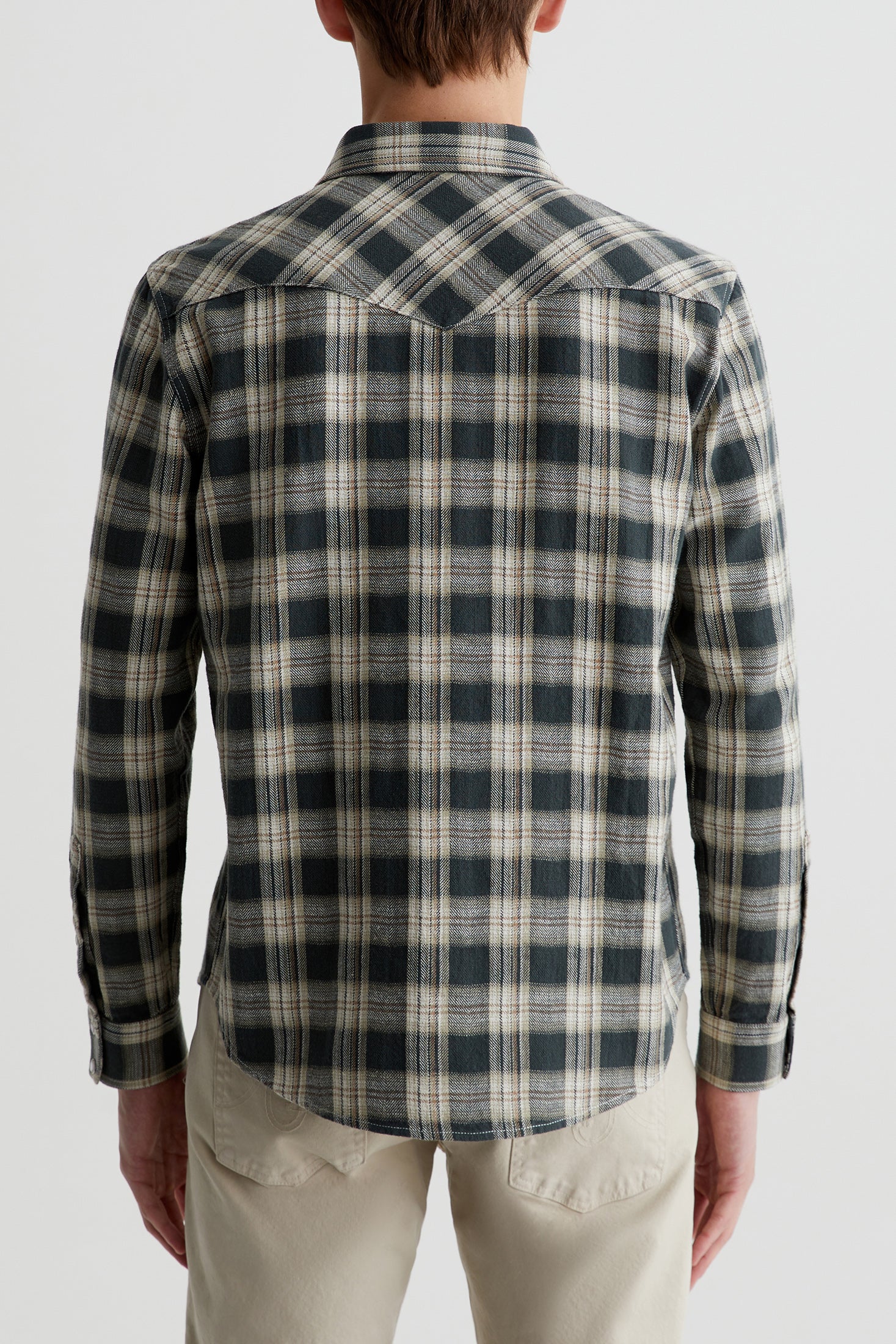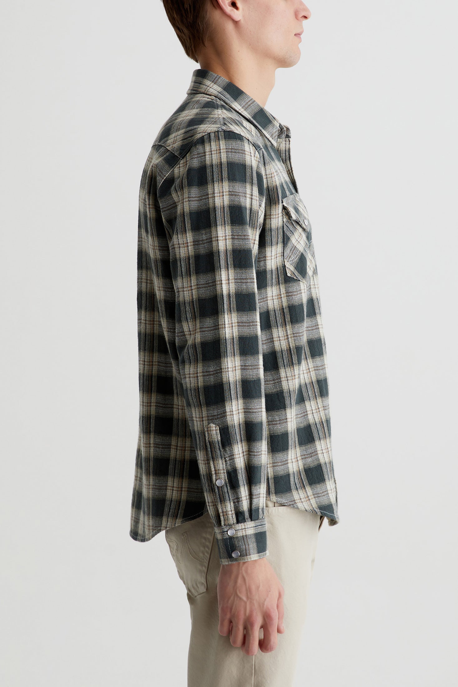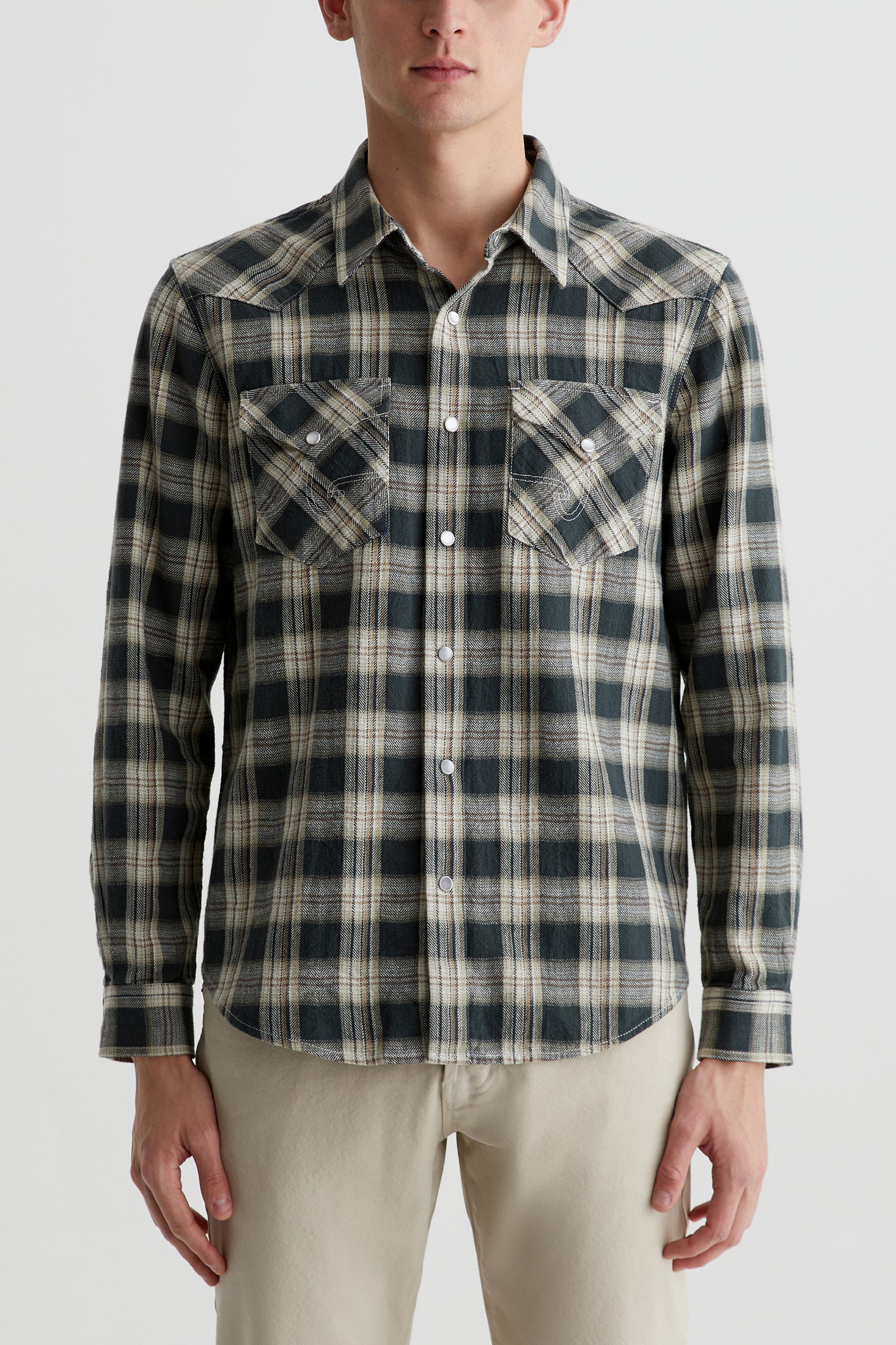 Rooted in classic Americana, the Huston Western Shirt blends timeless design with everyday ease. The 100% cotton yarn dye plaid with herringbone construction adds a vintage touch, while the classic fit and long sleeves keep it versatile for any season. Finished with two AG embroidered front pockets and a black snap-button closure detail.