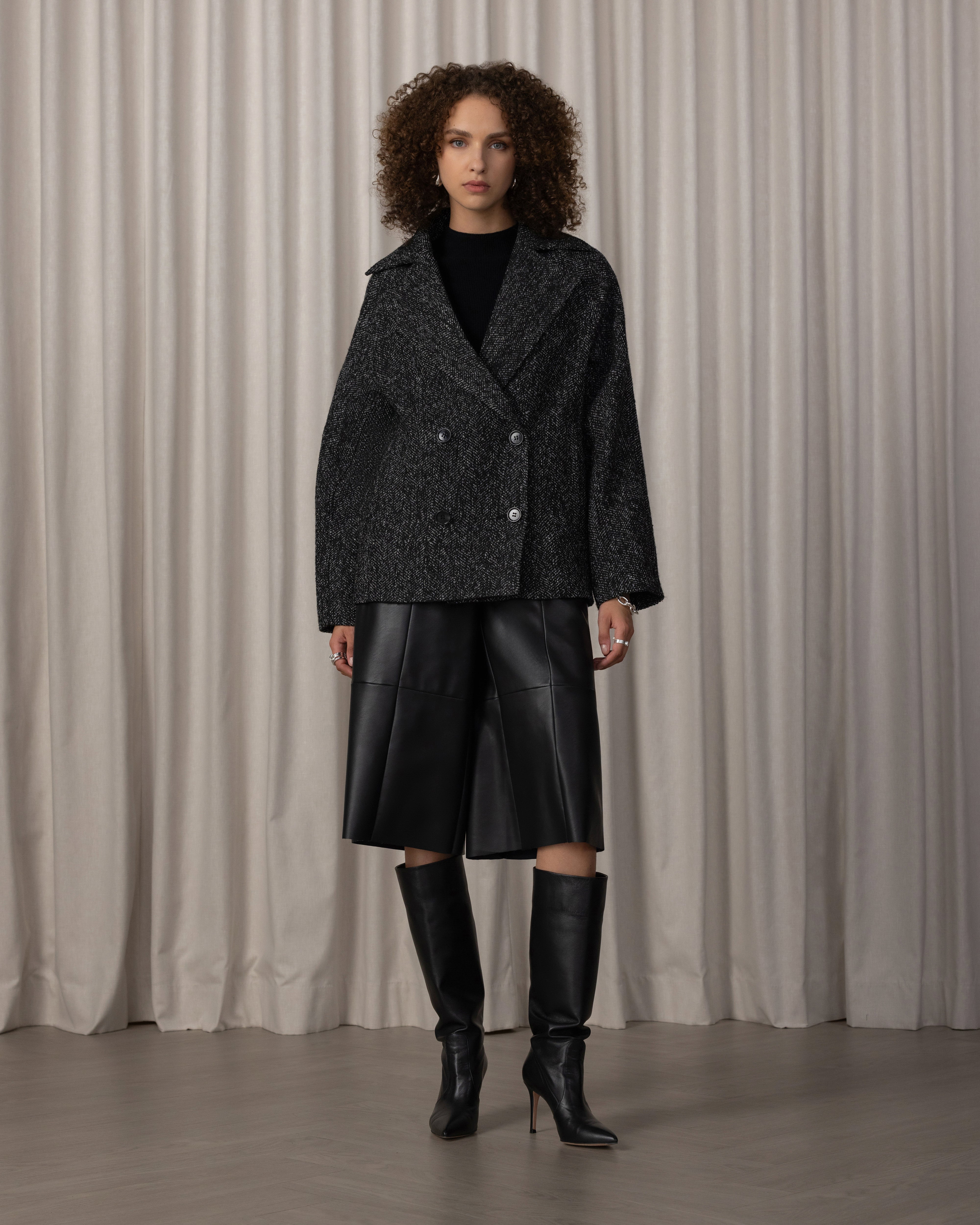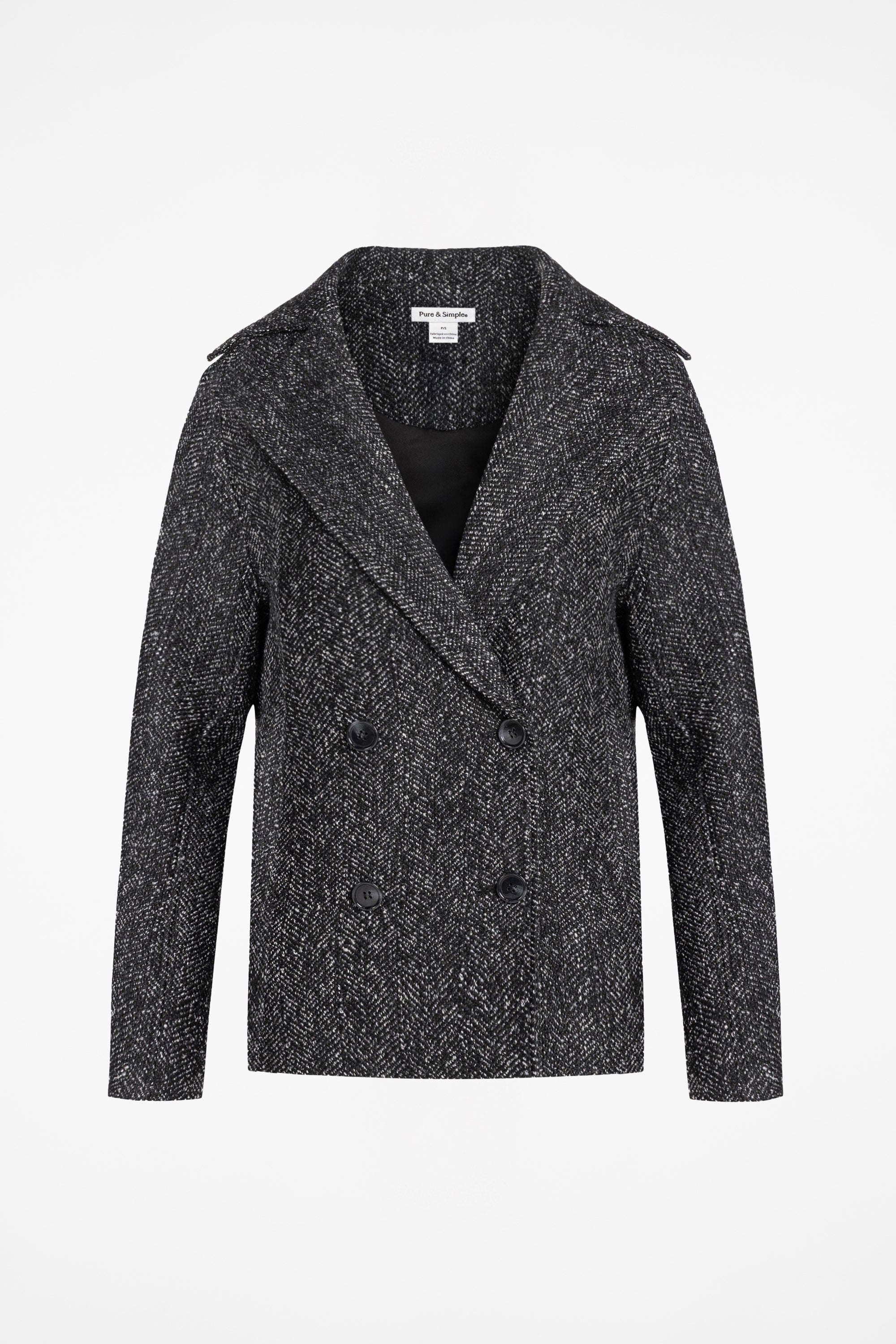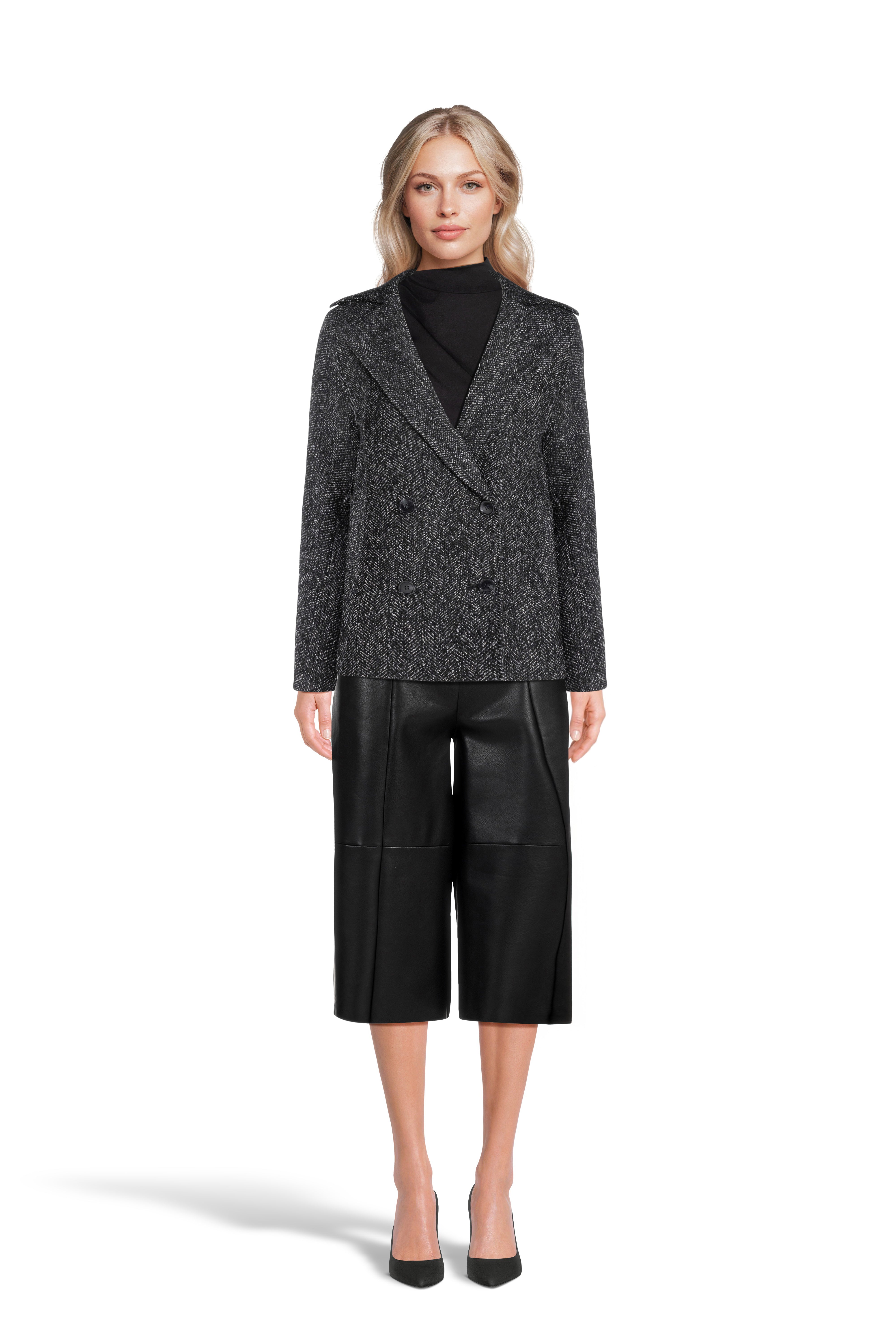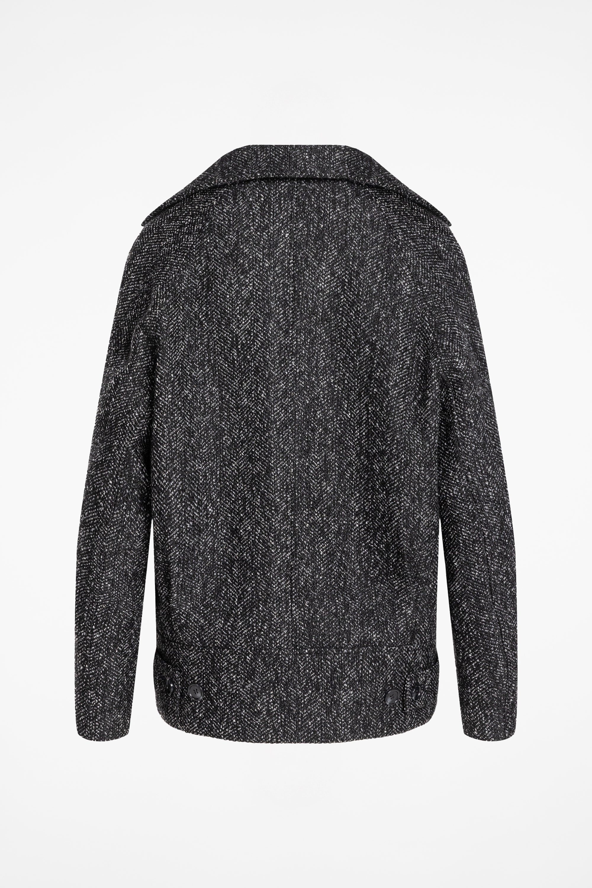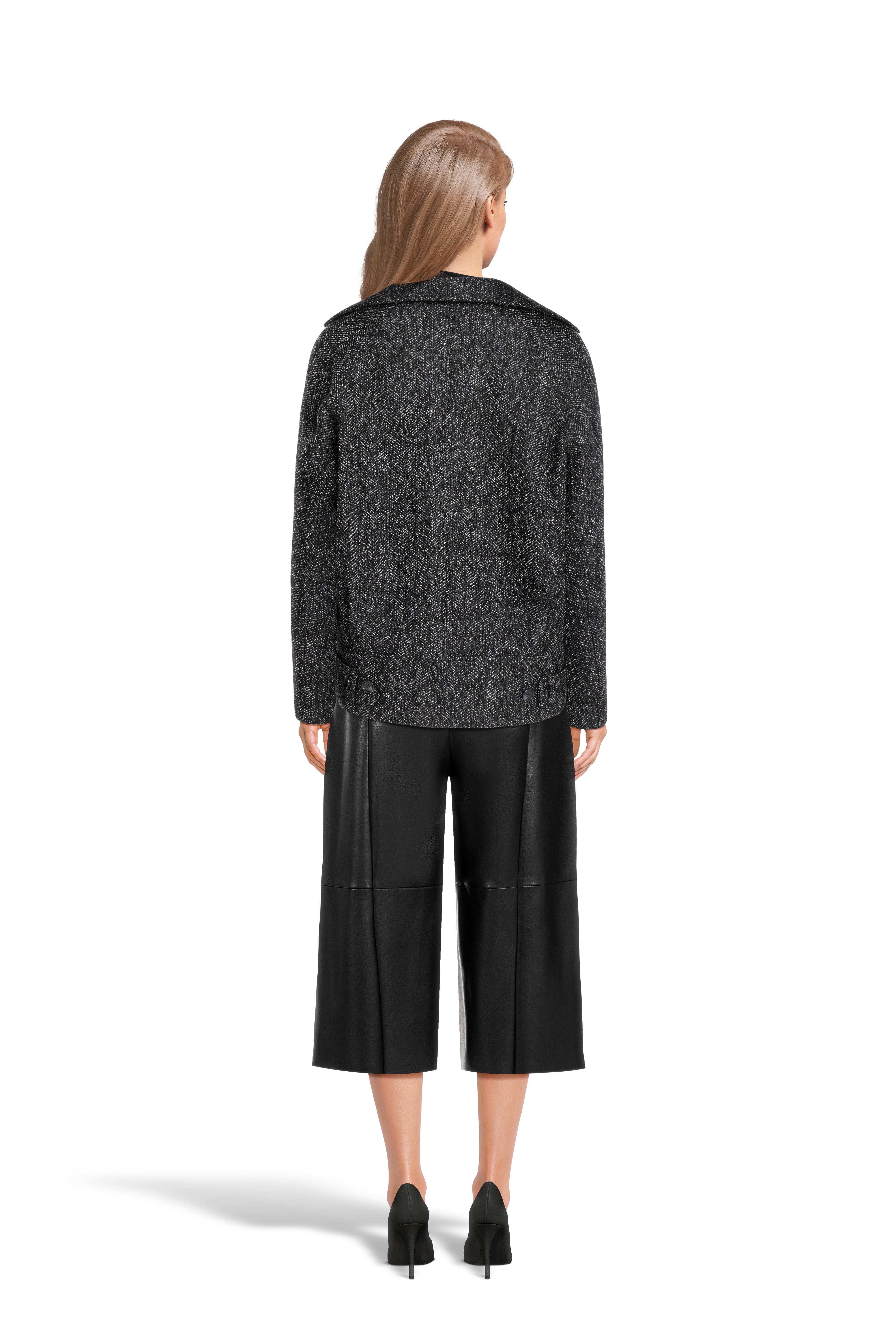 The Soho Cocoon Jacket in soft heathered tweed features an oversized silhouette, raglan sleeves, an adjustable back tab and a chevron-textured weave.