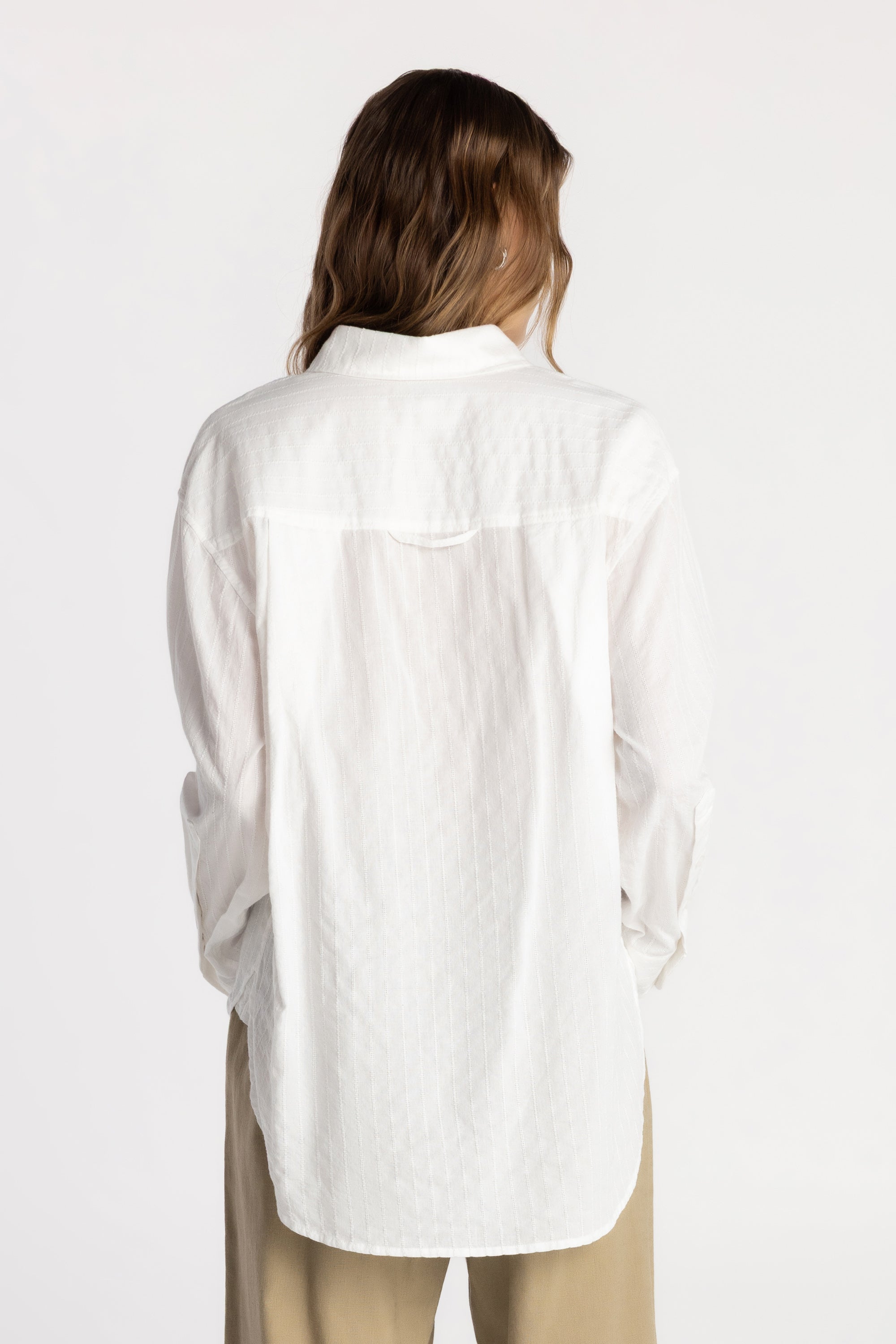 The AM To PM Boyfriend Shirt is designed for effortless, all-day wear with a relaxed silhouette. Made from lightweight striped embroidery cotton, it delivers breathable comfort with subtle texture. The stand collar and button-down front keep the look clean, while a single chest pocket adds classic detail. Long sleeves feature functional roll-up loops for adjustable styling, and the curved hem makes it easy to wear tucked or loose from morning meetings to evening plans.