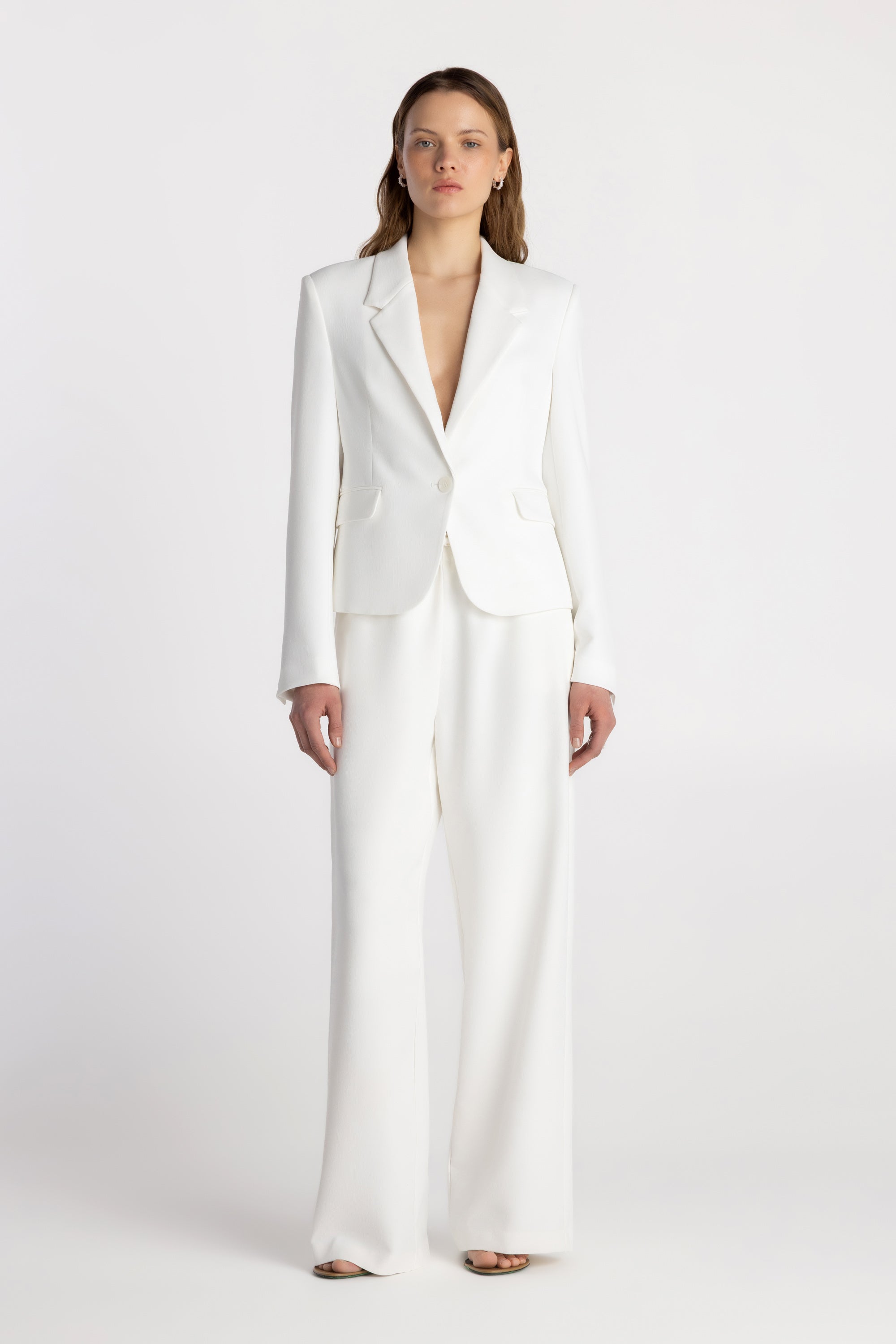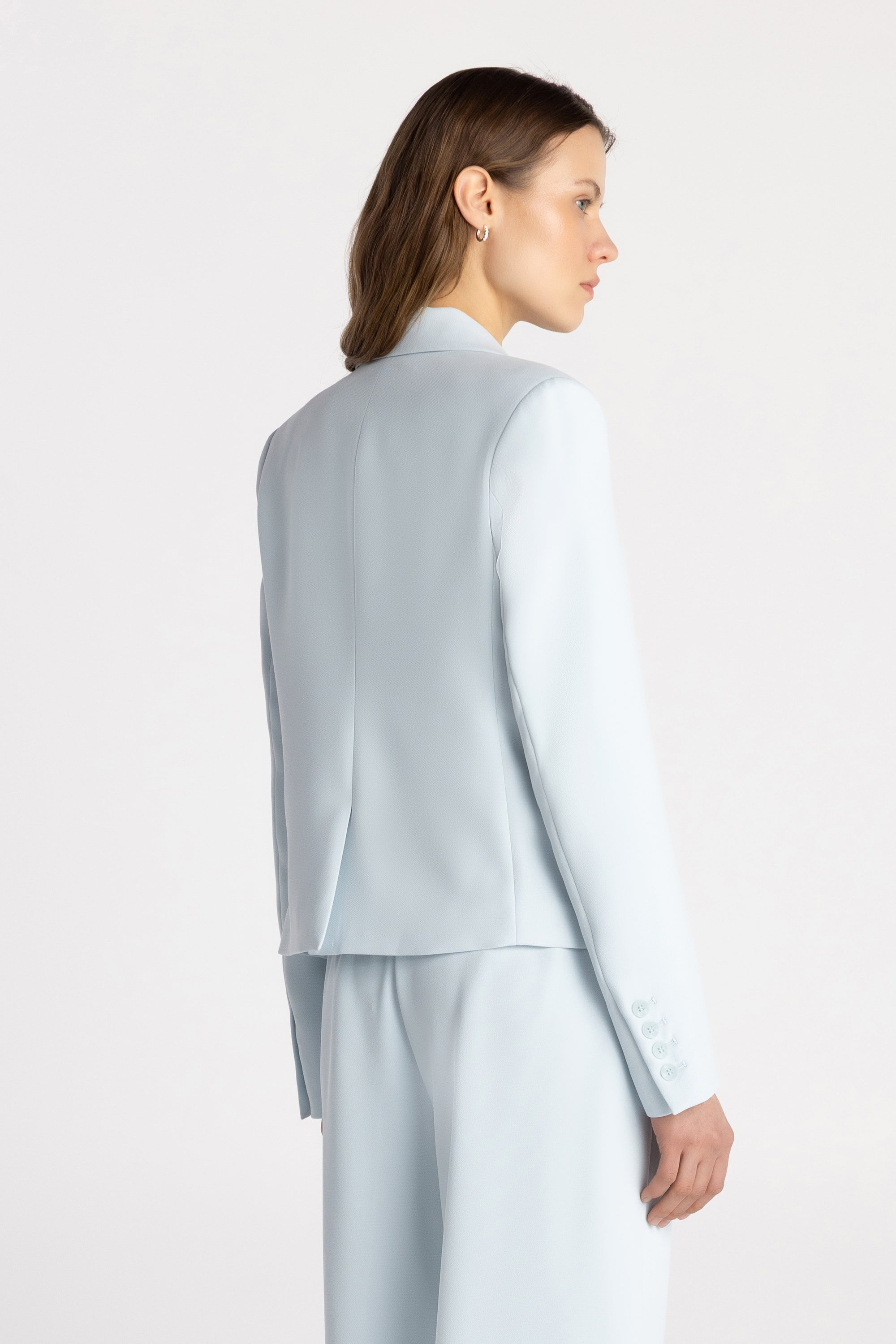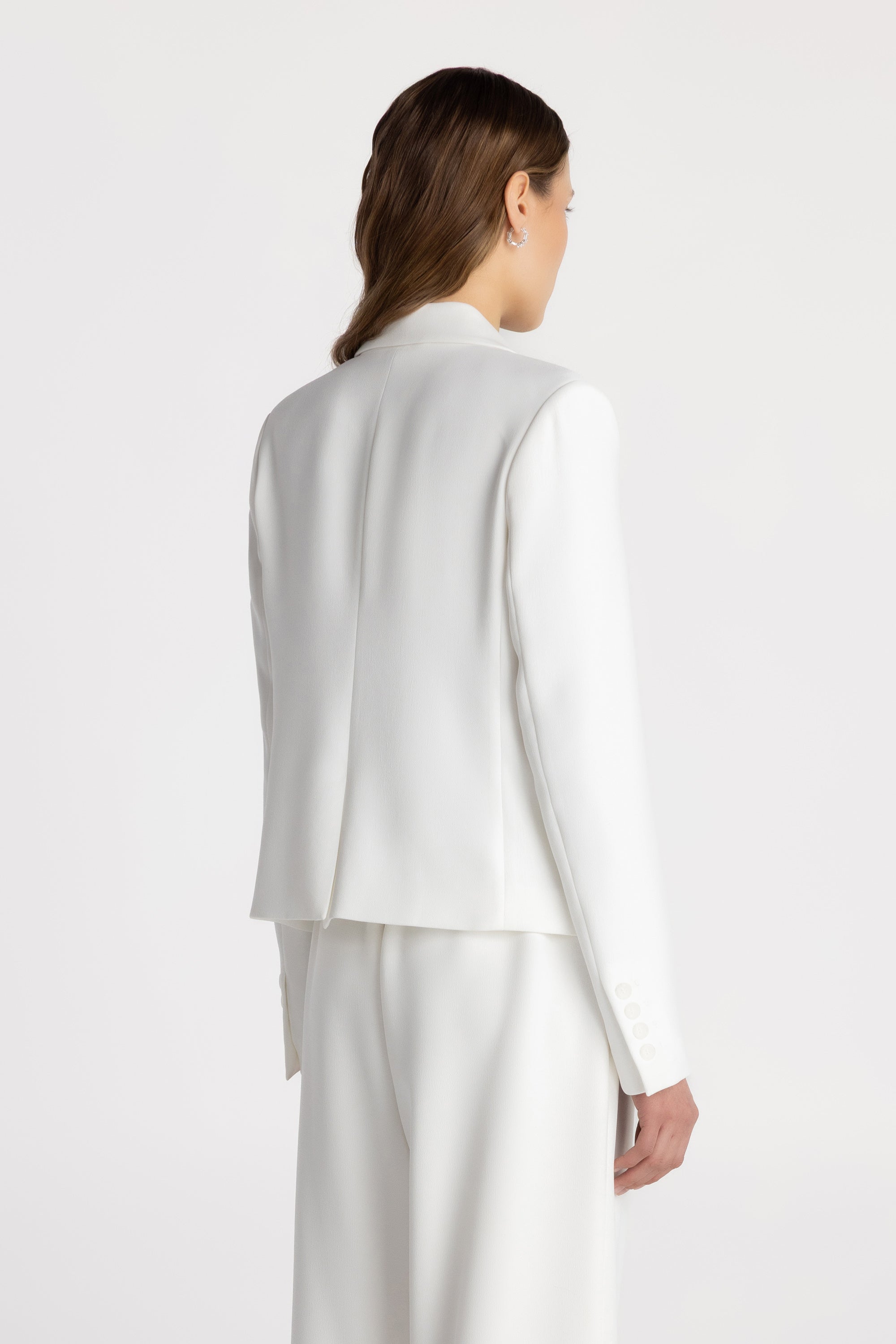 The Andee Blazer delivers tailored structure in a modern high-hip silhouette. Crafted from woven textured crepe, it offers a polished finish with comfortable structure. Designed with a classic notch collar and single-button closure, this fully lined blazer features shoulder pads for refined shape, front welt pockets with flaps, and a chest welt pocket. Sleeve vents with buttons and a back vent enhance movement, creating a timeless, minimalist piece that transitions seamlessly from work to evening.