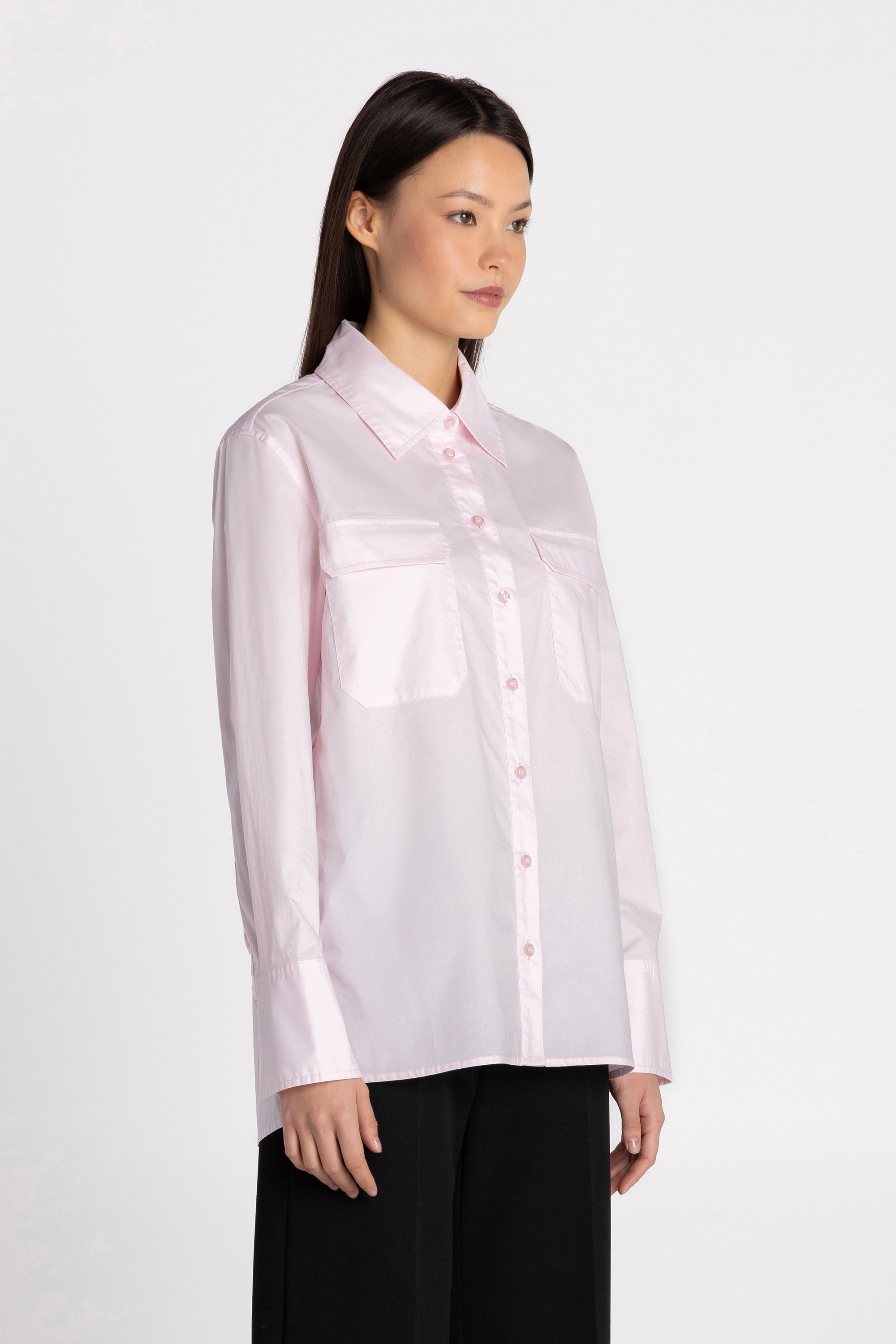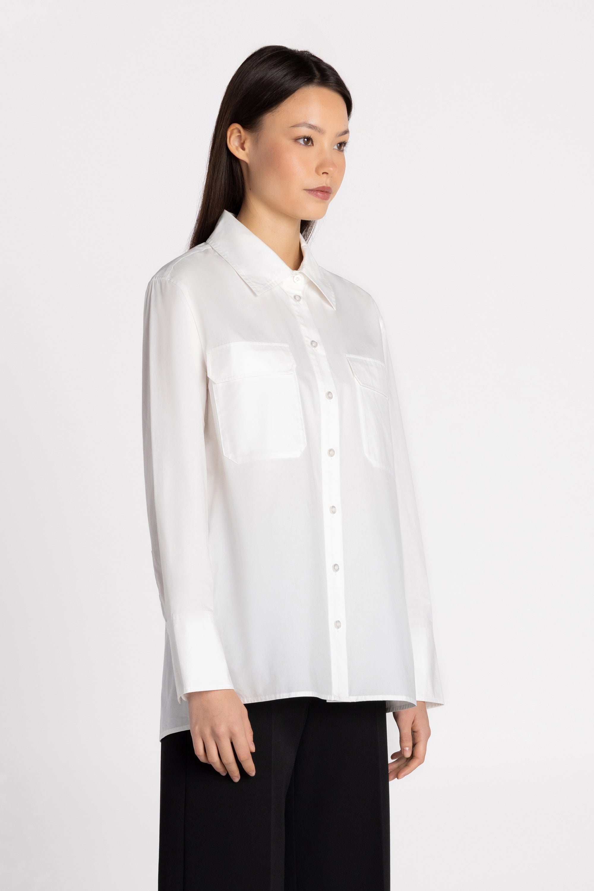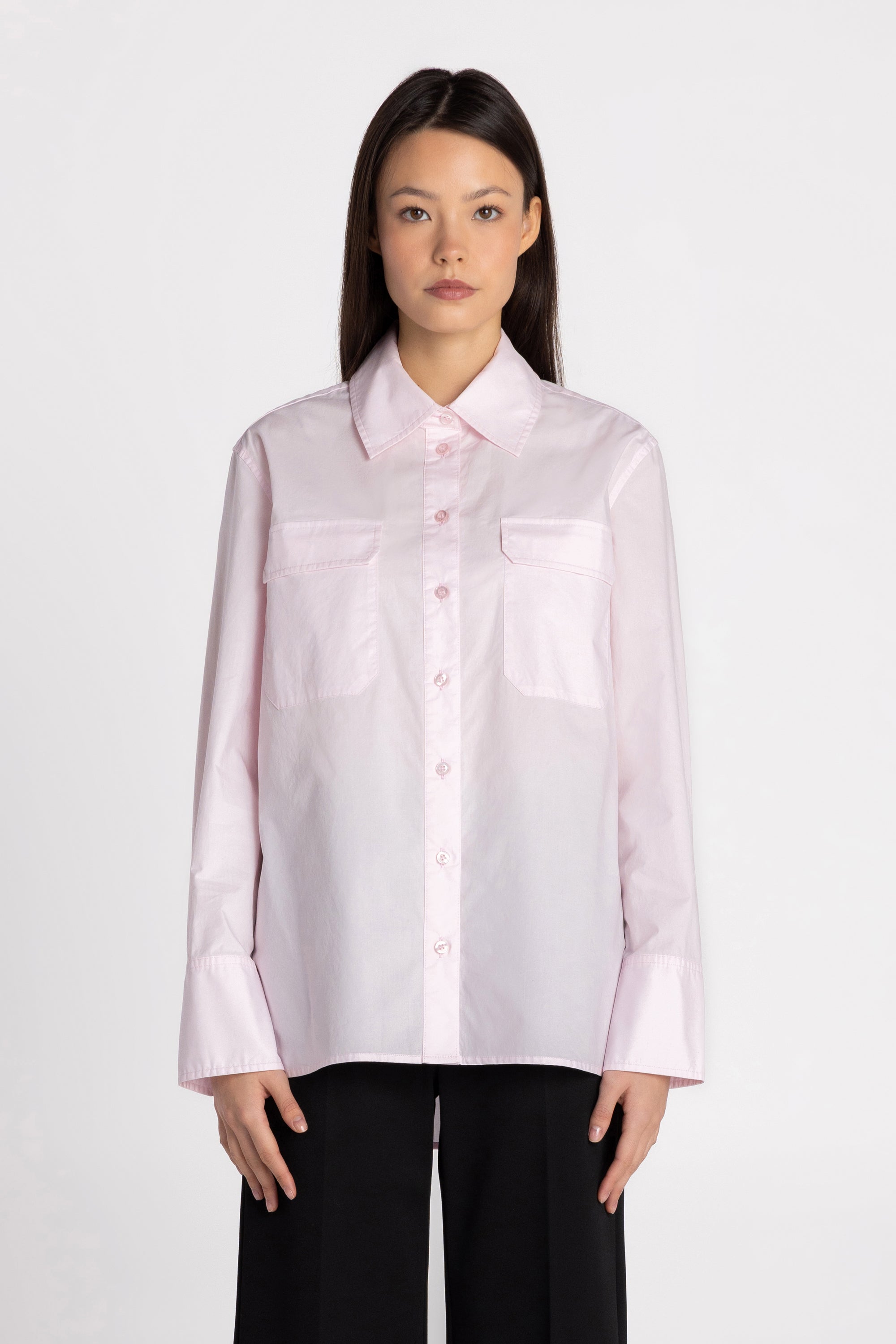 The Jane Long Sleeve Shirt is designed for effortless everyday dressing with a clean, tailored edge. Made from slick, crisp cotton poplin, it delivers breathable structure with a refined handfeel. The relaxed silhouette makes it easy to wear tucked in or loose, while a stand collar and button-down front keep the look polished. Utility-inspired flap chest pockets and elongated button cuffs add subtle function. Finished with a straight hem and side slits for comfortable movement.