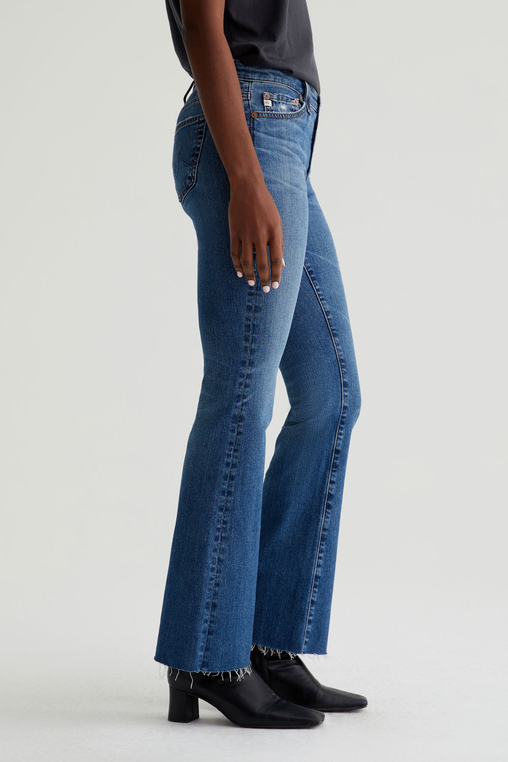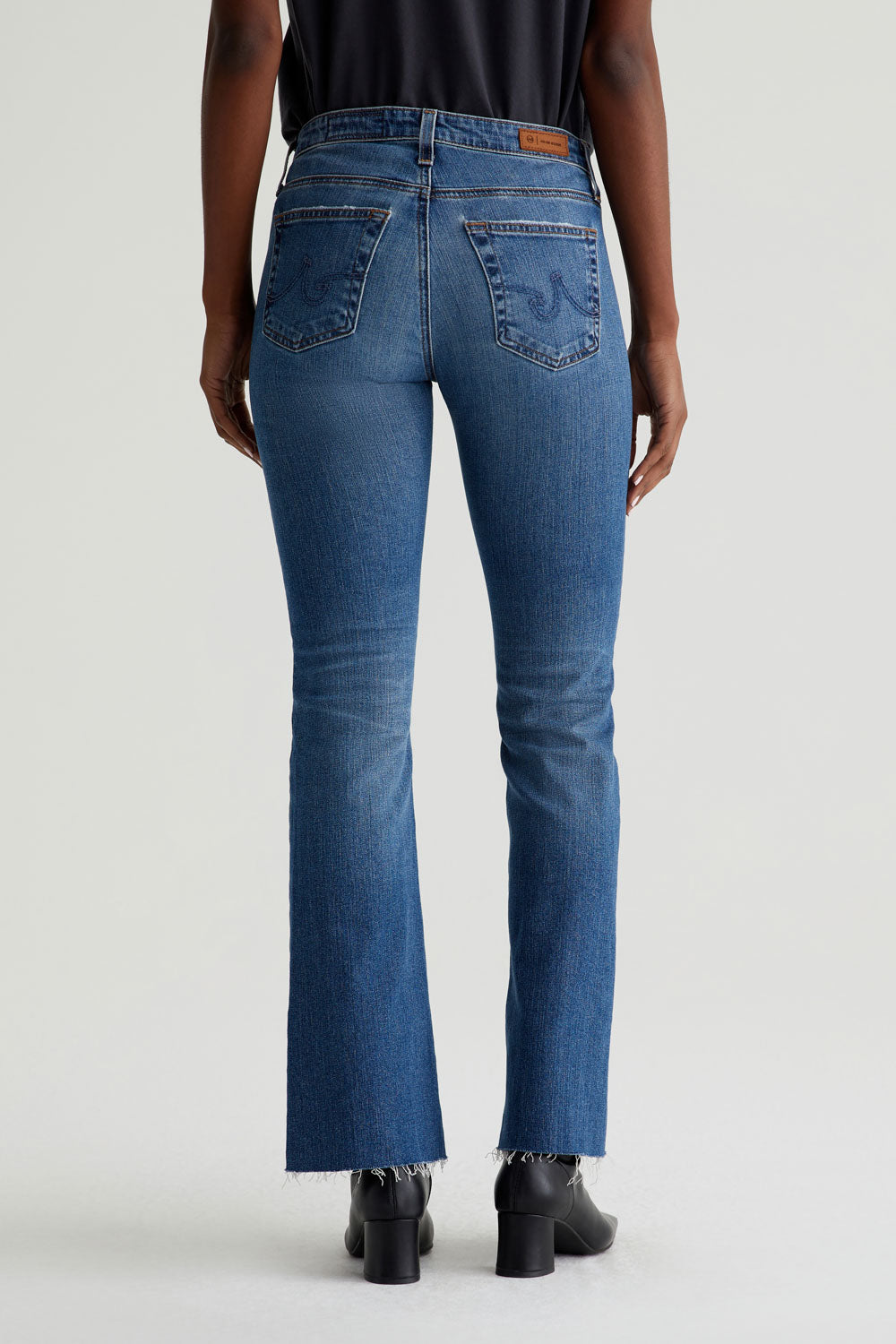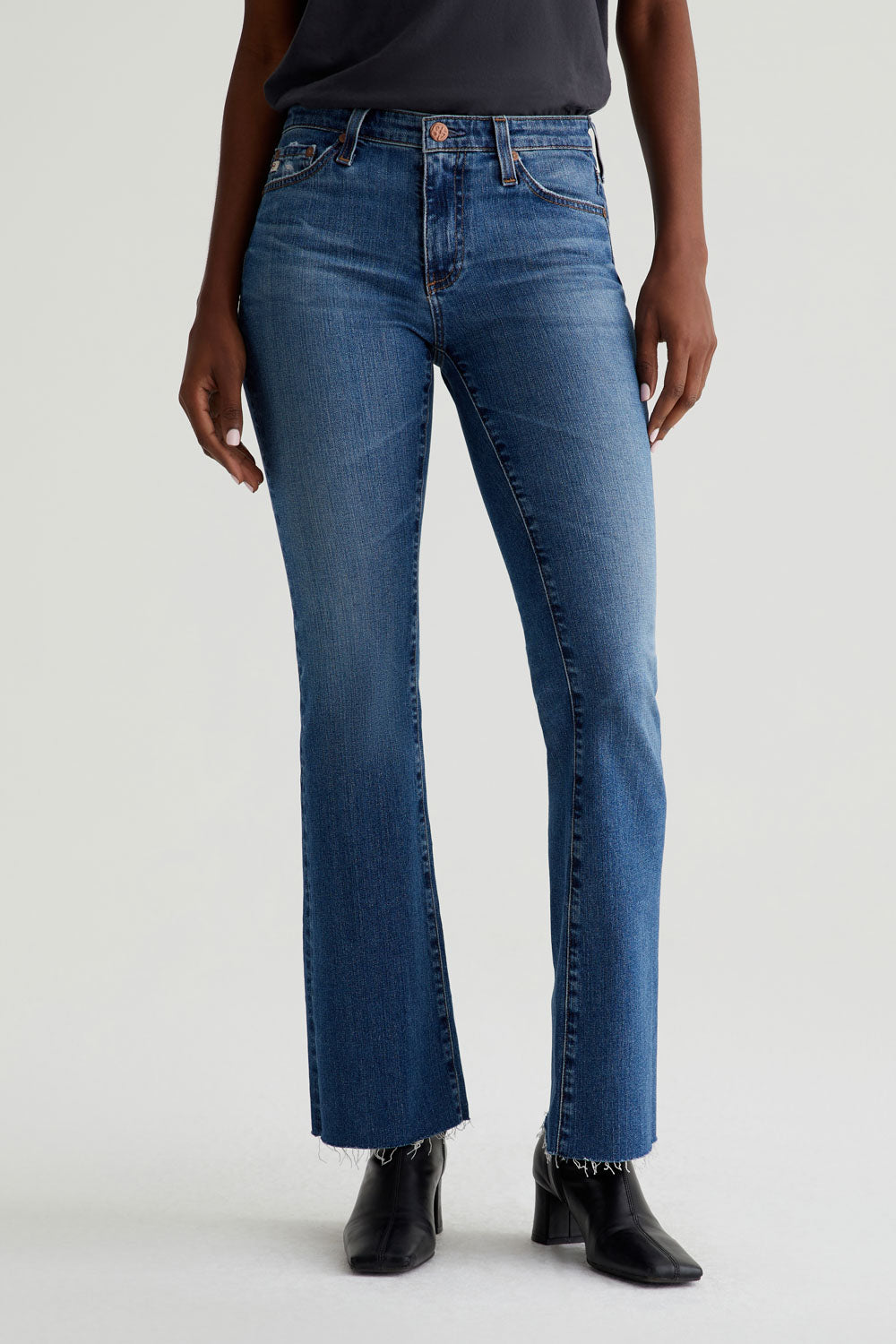 Our Angel low-rise bootcut jeans feature an AG-ed™ dark indigo wash that's faded to emulate 15 years of vintage wear. Cut from 11 oz. Lead Denim, these five-pocket jeans are blended with stretch for a flattering, comfortable fit. Complete with raw hems, softly worn pocket edges, and classic marigold stitching.