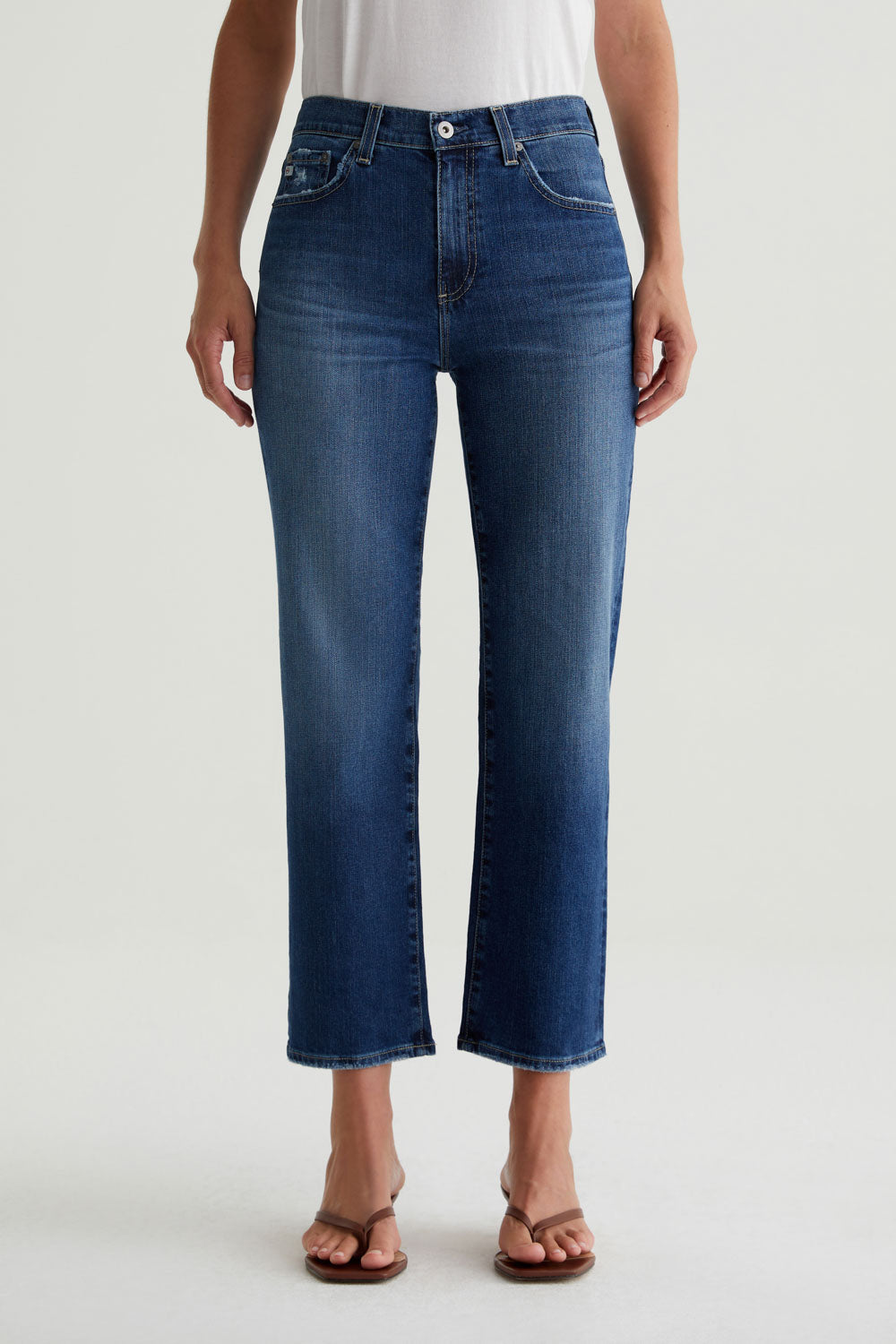 The Brinley Crop features a mid-rise waist and a straight-leg silhouette with frayed, ankle-baring hems. Designed in Vintage Comfort Stretch Denim from Italy, these cropped jeans for women have a dark indigo AG-ed™ wash with faded details, worn edges, and a bit of distressing at the pockets.