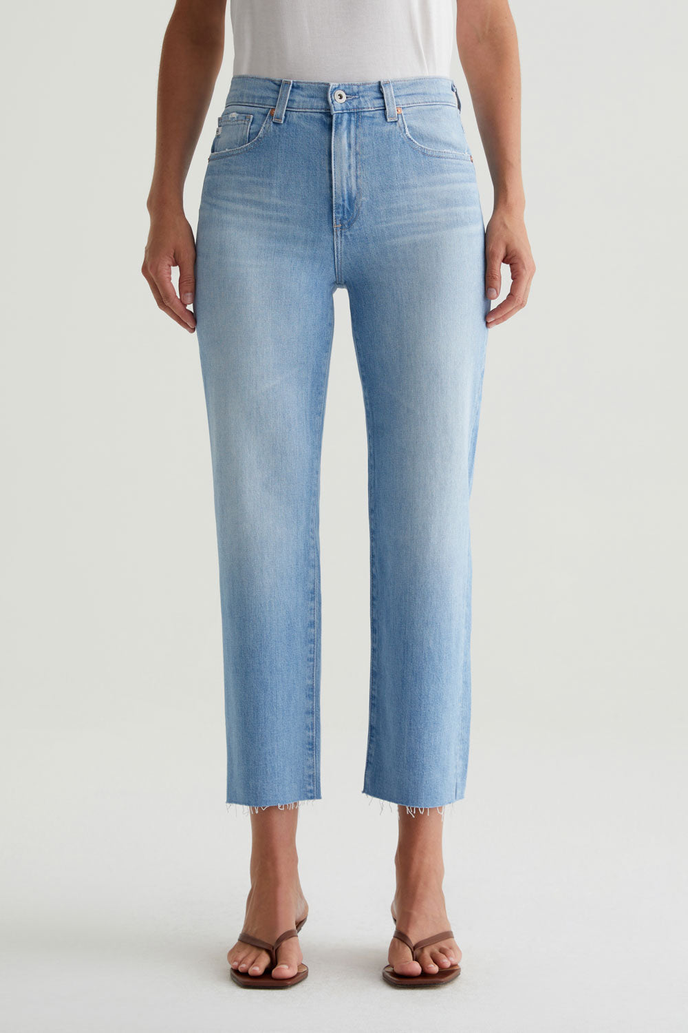 The Brinley Crop features a mid-rise waist and a classic straight-leg silhouette with raw, ankle-baring hems. Designed in stretch-blend Journey Denim from Italy, these cropped straight-leg jeans have a light wash with faded details and a bit of distressing at the pockets.
