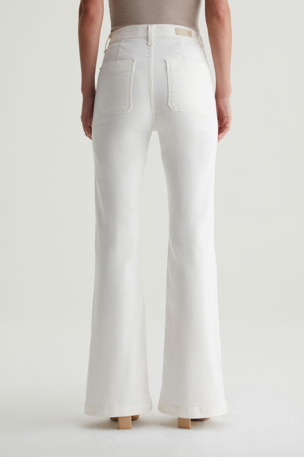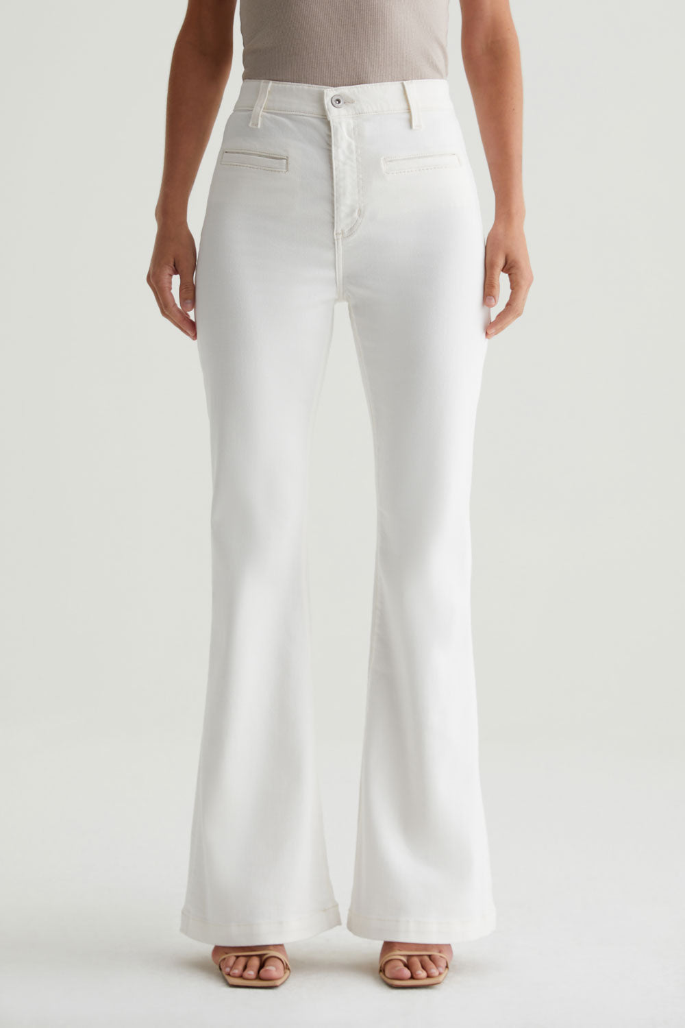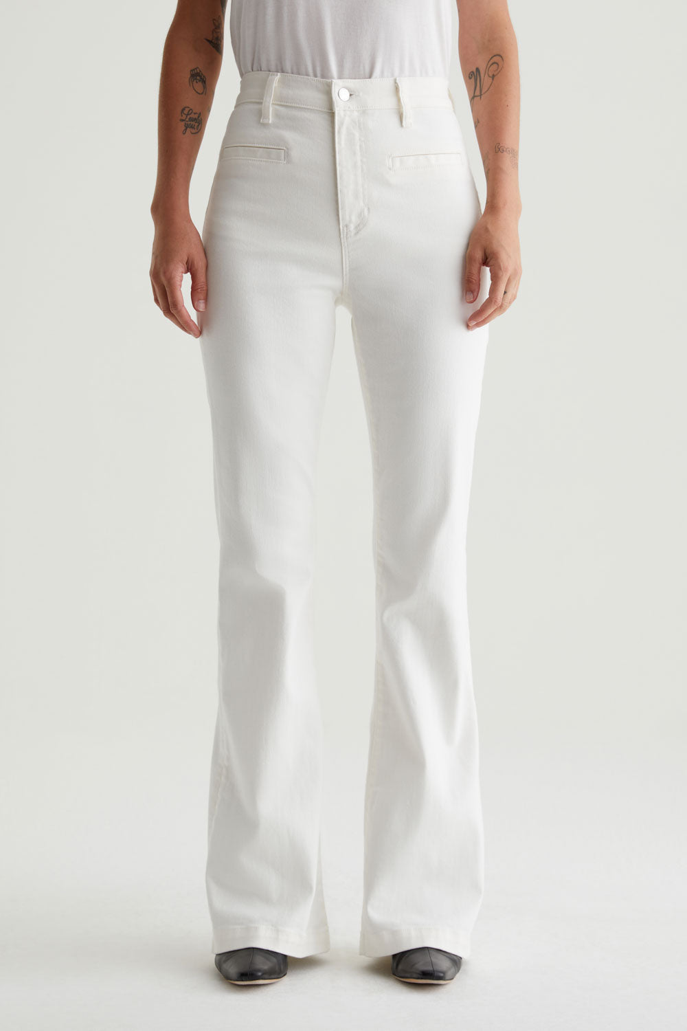 Desi is a '70s-inspired high-rise flare that's designed to hug the hips and elongate the legs. Based on our Madi fit, the style has tidy welt pockets at the front and patch pockets at the back. These off-white flare jeans offer exceptional comfort in 10.25 oz. Cloud Soft Stretch Denim, an exclusive AG fabric that's been designed to get softer with every wear.