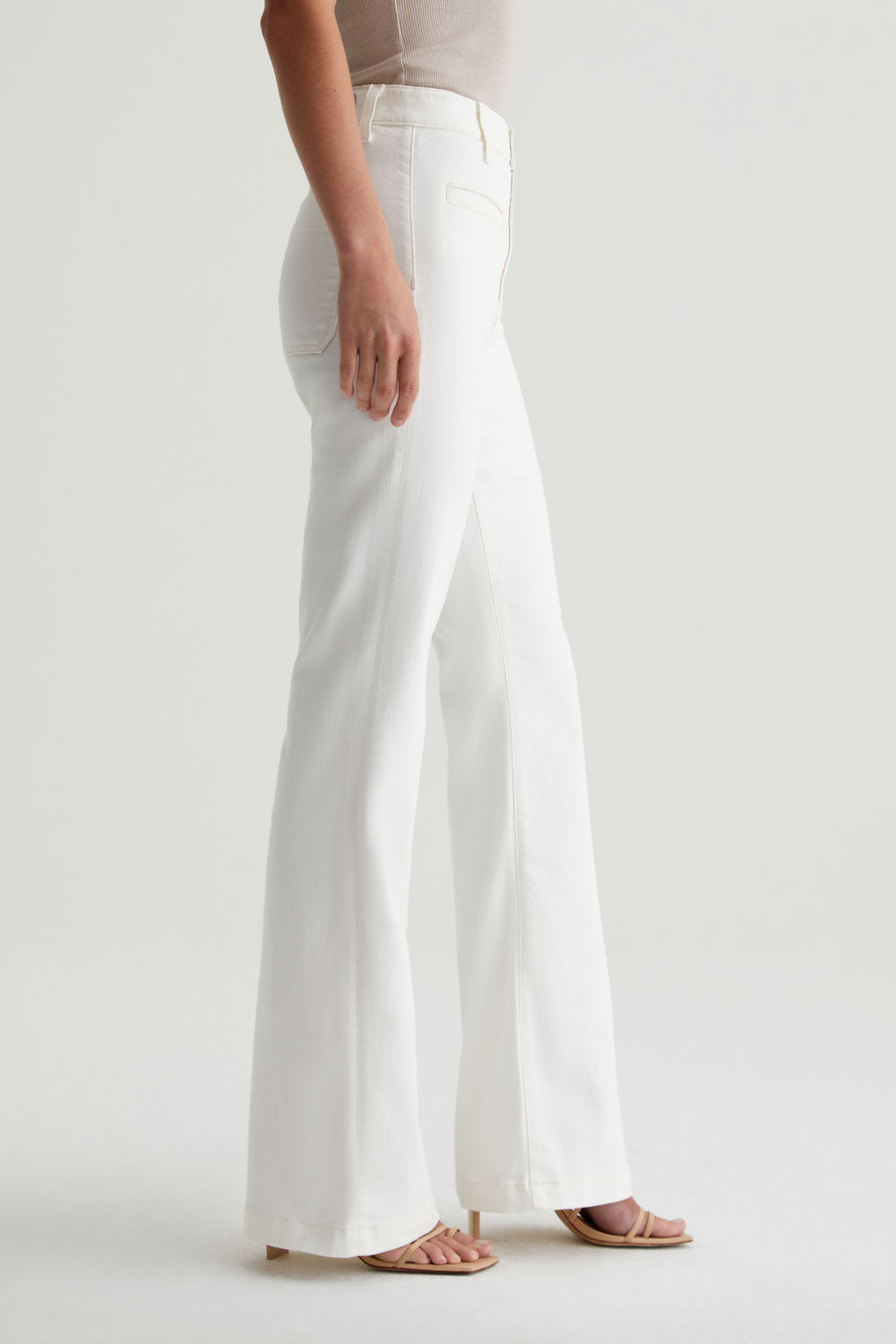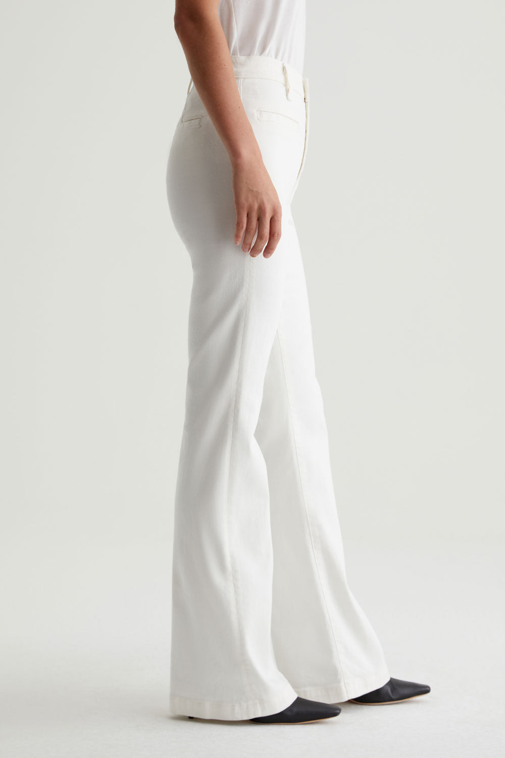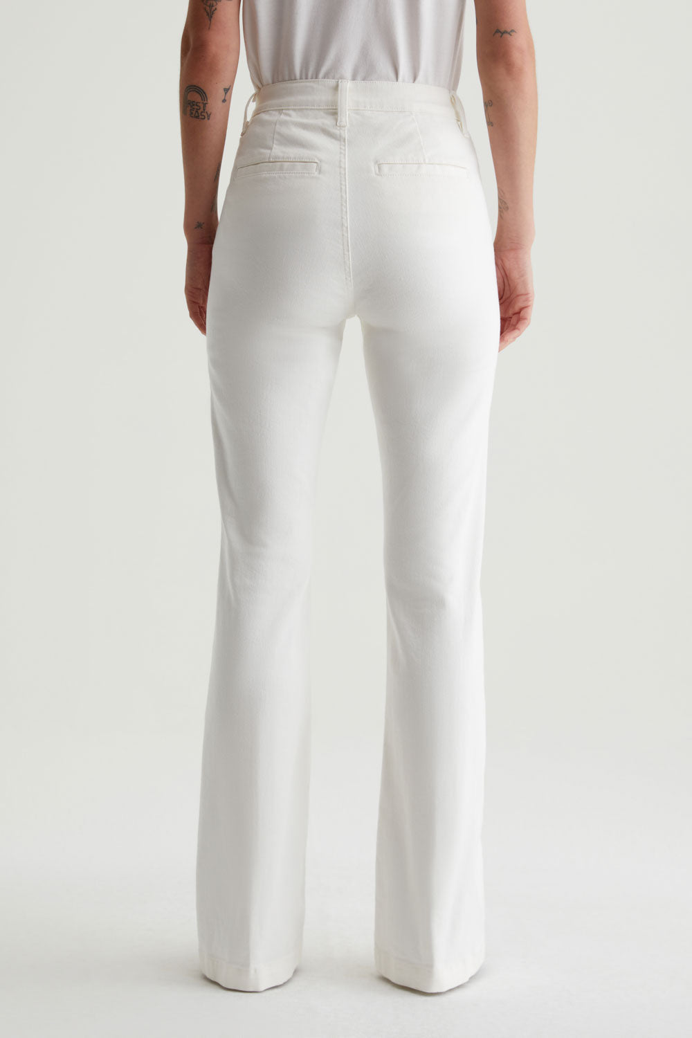Desi is a '70s-inspired high-rise flare that's designed to hug the hips and elongate the legs. Based on our Madi fit, the style has tidy welt pockets at the front and patch pockets at the back. These off-white flare jeans offer exceptional comfort in 10.25 oz. Cloud Soft Stretch Denim, an exclusive AG fabric that's been designed to get softer with every wear.