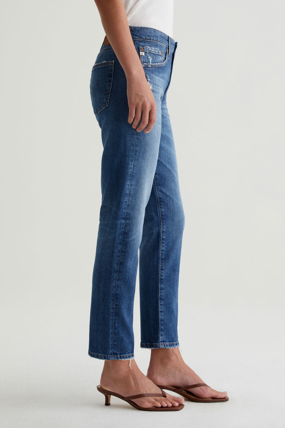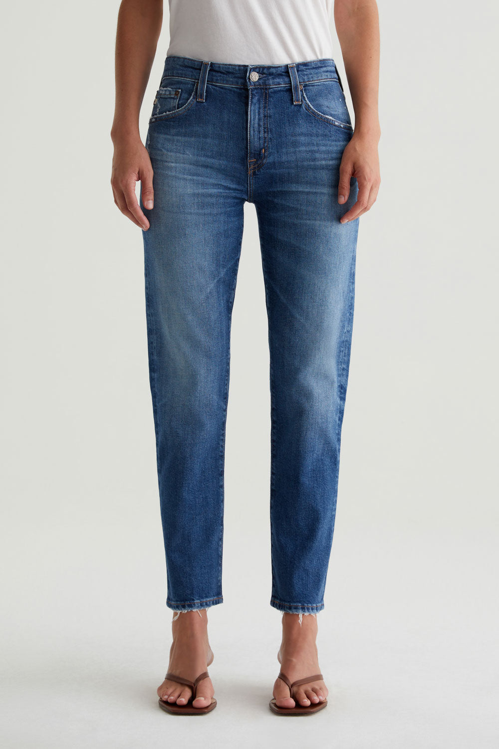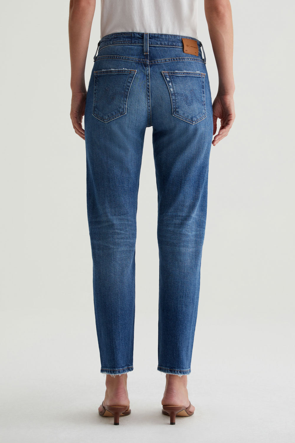 Our Ex-Boyfriend Slim has a slouchy mid-rise silhouette with slim legs and fraying hems. These relaxed-fit women's jeans come in 11.75 oz. Vintage Comfort Stretch Denim from Italy and feature a medium indigo stonewash with a 14-year AG-ed™ finish. The pair is faded and whiskered for the look of vintage jeans—complete with a bit of distressing at the pocket area.