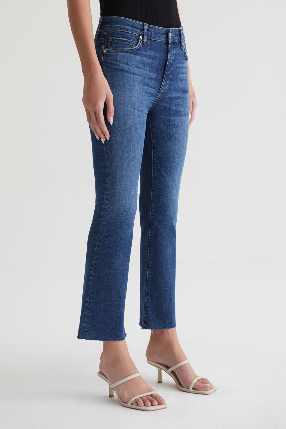 Our Farrah Boot Crop features a mid-rise bootcut silhouette with raw, cropped hems. The pair sits right at the natural waist and has a skinny fit through the legs before opening into a subtly flared shape. Crafted from stretch-blend 10.5 oz. Marthy Deep Blue Denim, these women's bootcut jeans come in a dark indigo wash with faded details and subtle wear along the pocket edges.
