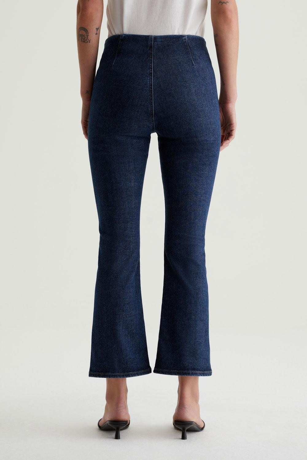 A pull-on version of the Farrah Boot Crop, designed without hardware or pockets for a sleek and super-comfortable fit. Made in 13 oz. Indigo Ultra Stretch Denim from Japan, these mid-rise bootcut jeans have a clean, dark wash and a skinny fit that opens into a subtle flare.