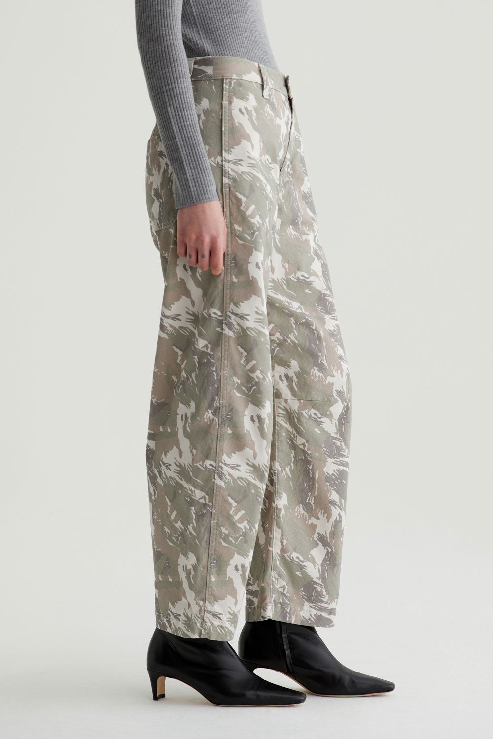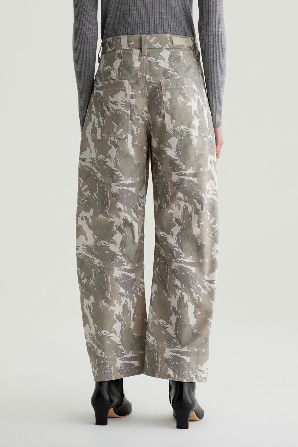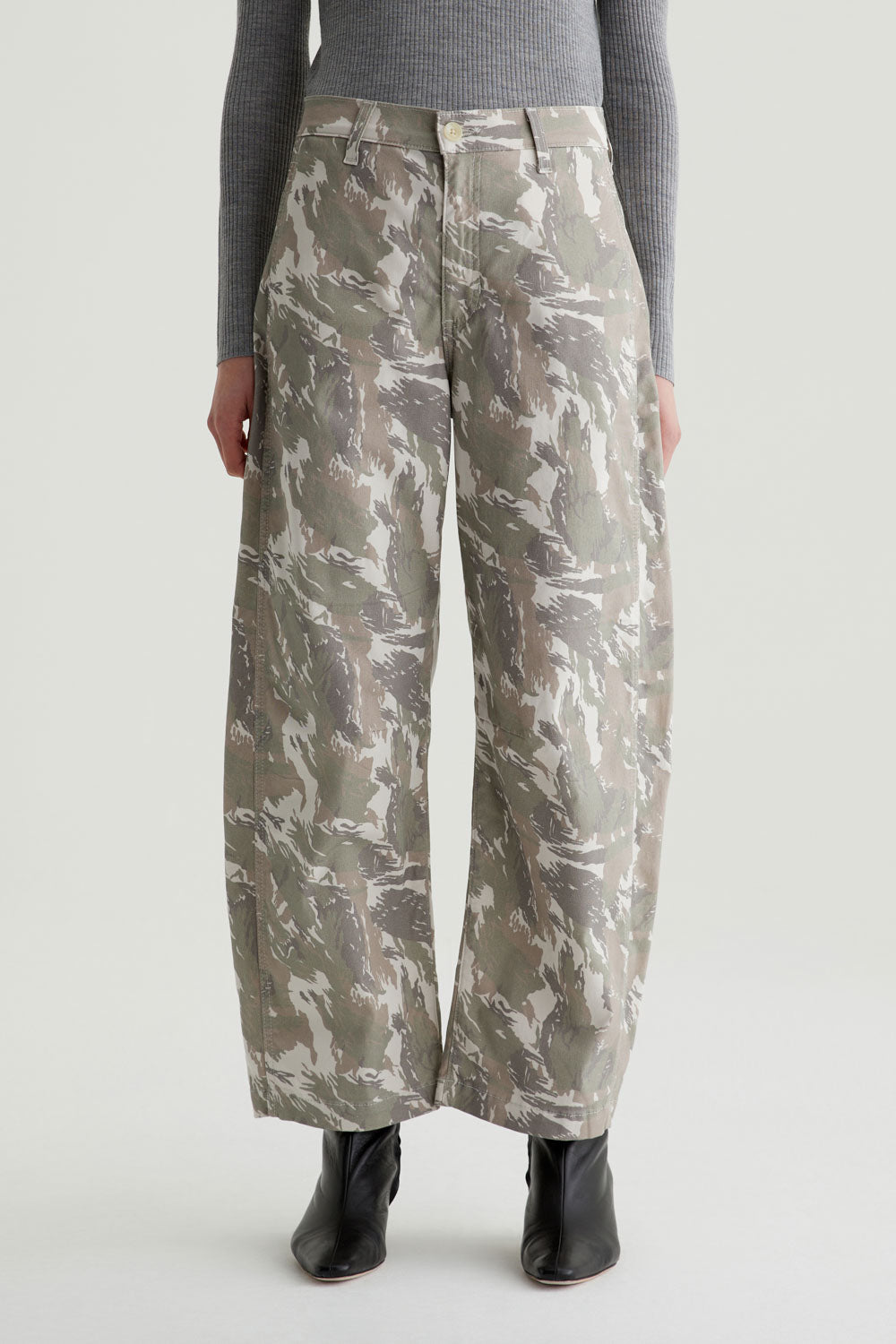 Fiona is a barrel-leg chino with a high waist and slant front pockets. Landing at an ankle-skimming length, it's got slightly curved outer seams and darting at the inner knees. Featuring a camo print of neutral shades, these barrel-leg trousers have a soft, supple feel in 7.9 oz. Sorrento Stretch Twill from Italy.