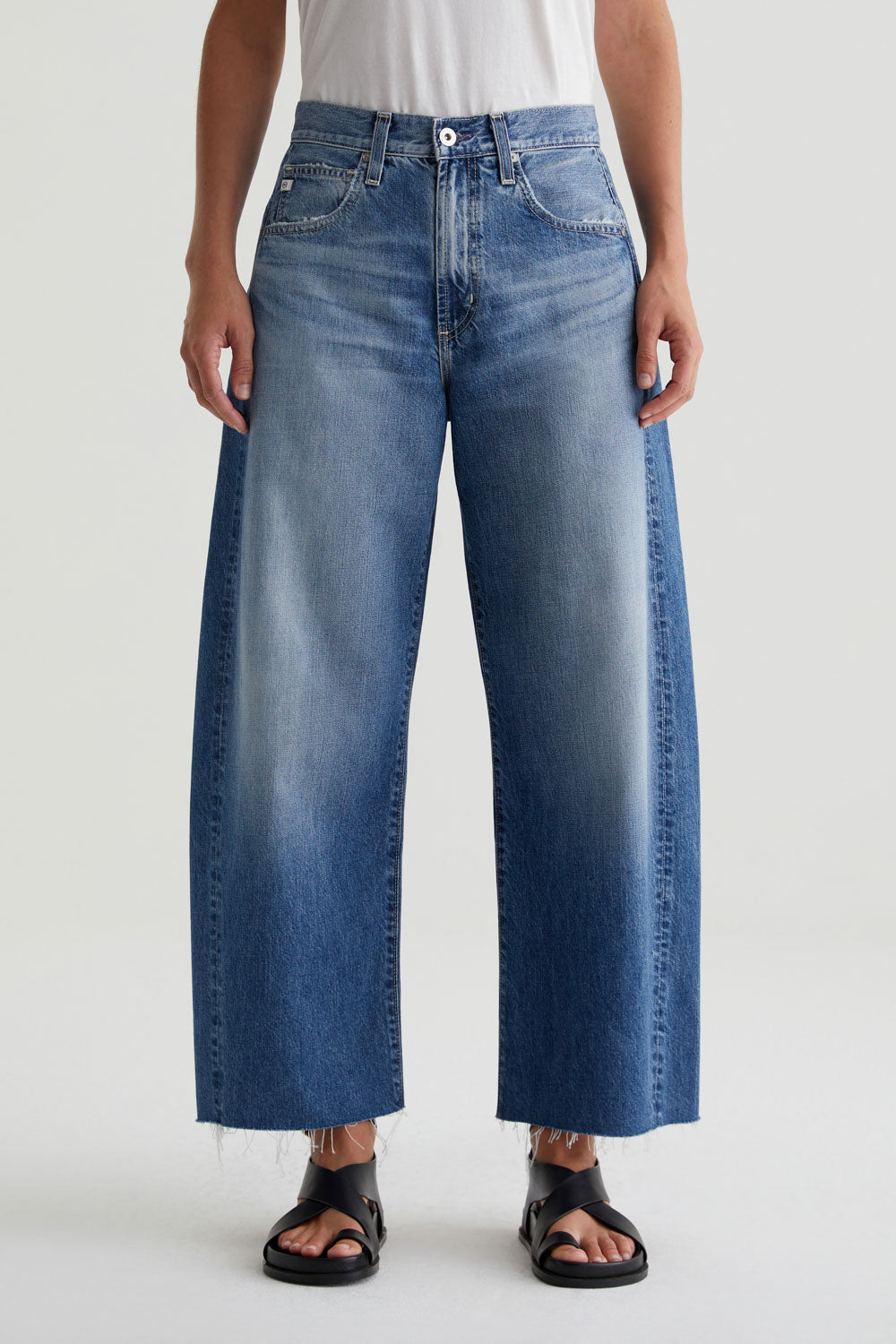 A cropped version of our Hattie barrel jeans. The Hattie Crop has an ultra-high waist and a curved shape at the legs, complete with side-seam paneling and raw hems that land above the ankle. Designed in Legion Denim from Japan, this pair features 100% cotton construction in a faded medium-blue wash with worn pocket edges.