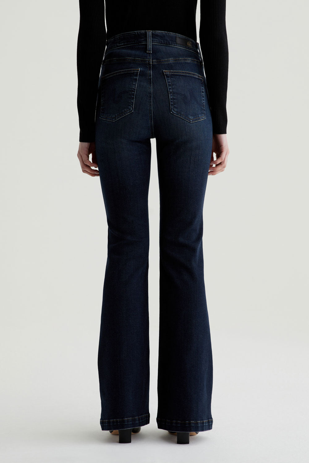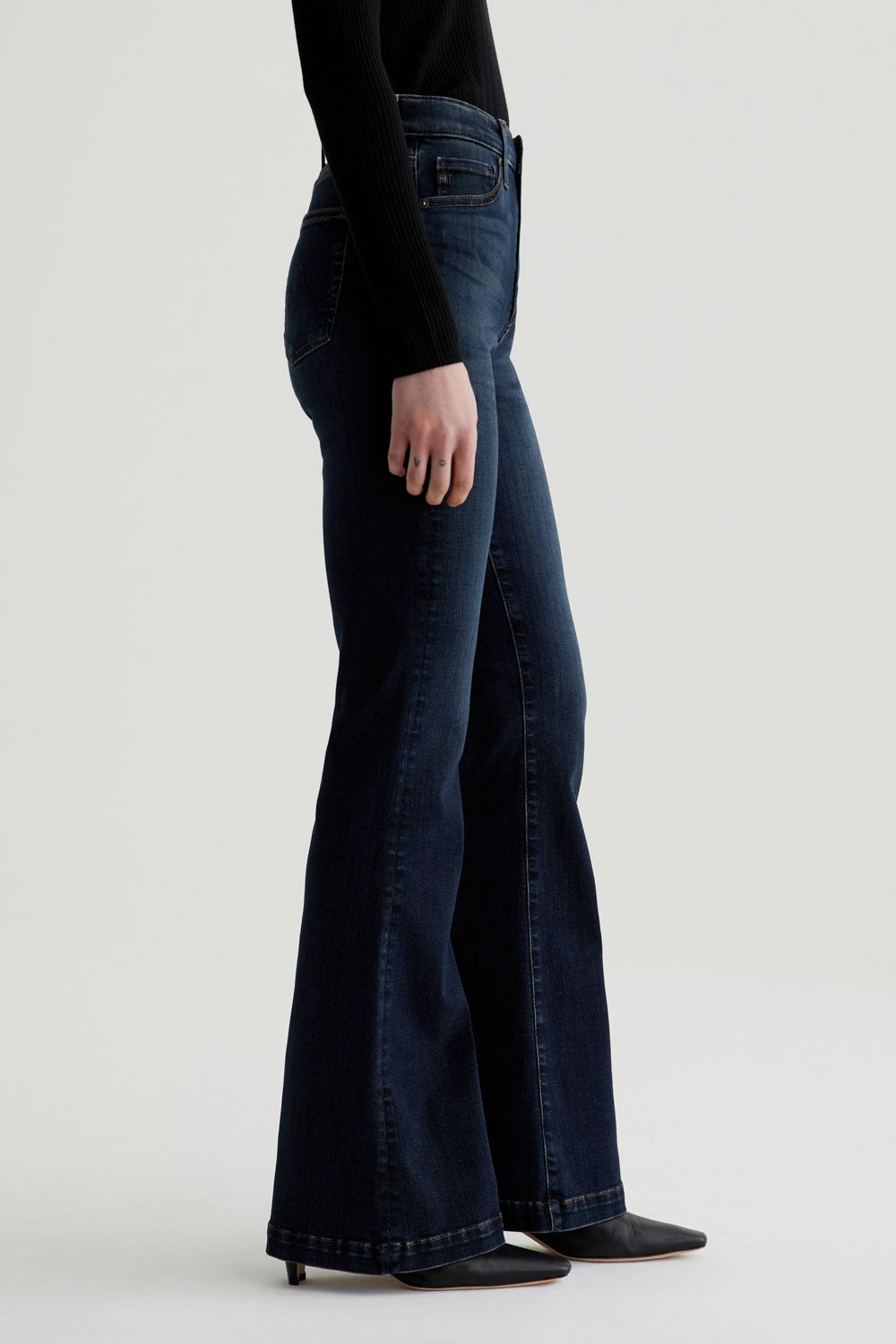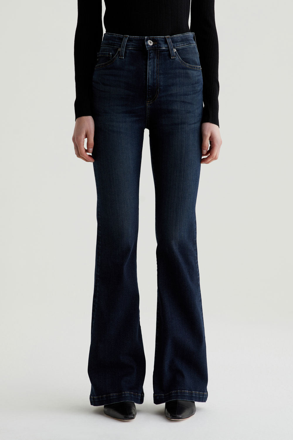 Our Madi high-rise flare jeans have a '70s-inspired silhouette that's incredibly flattering to the figure. Crafted from 9.5 oz. Premiere Stretch Indigo Denim in a dark blue wash, the style is designed to hug the hips and elongate the legs. The pair sits high on the natural waist and features an extended length that kicks out to a dramatic flare with wide hems.