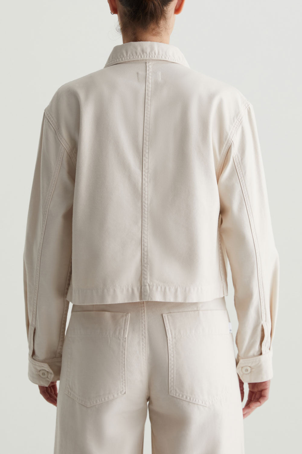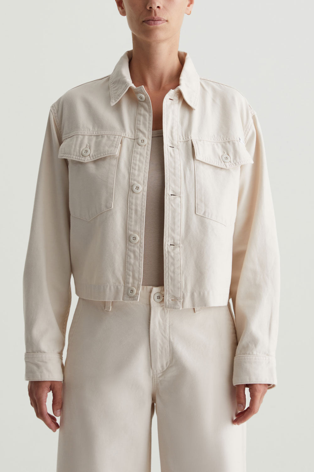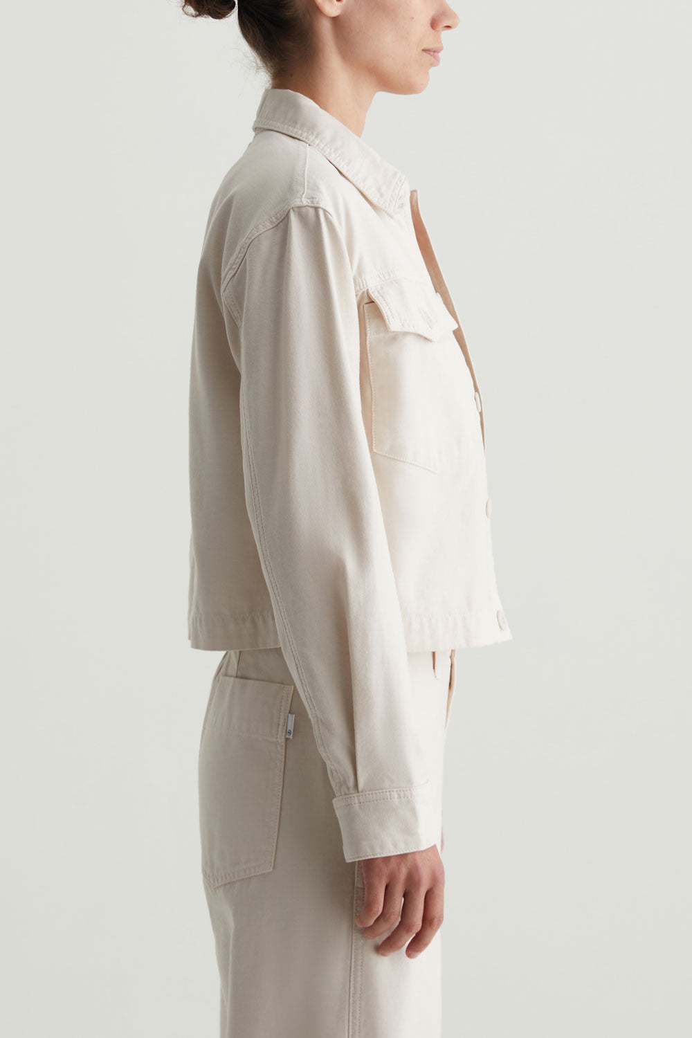 A cropped version of the classic utility shirt jacket, the Valleta layers with ease but also wears well on its own. This long-sleeve style comes in off-white Sternway Reverse Sateen and features button-through flap pockets at the front.