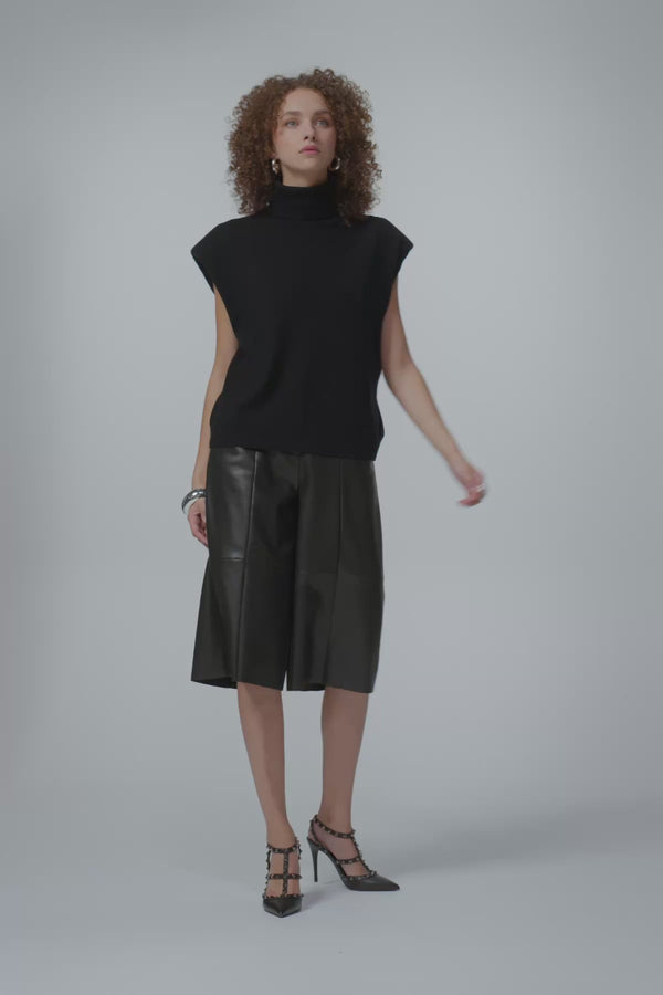 The Vogue Culotte delivers a high-waisted, wide-leg silhouette in water-resistant faux leather with a laser-cut raw hem and functional pockets.